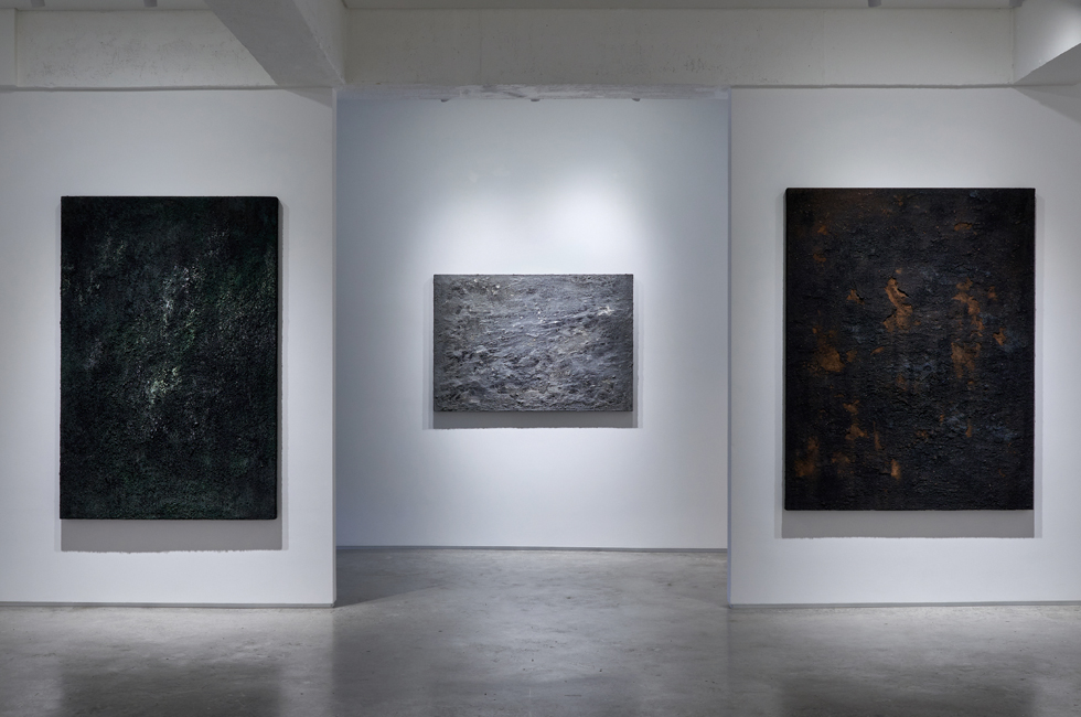 2 (왼쪽부터) ‘숲가(L’orée des bois)’, 145.5×97cm, 마대에 모래, 숯, 안료, 2025. ‘어떤 돌 하나(Une pierre)’, 80.3×116.8cm, 마대에 흙, 모래, 숯, 안료, 2025. ‘빛 없이 가는 광채(L’étincellement qui va sans lumière)’, 145.5×110cm, 마대에 흙, 숯, 안료, 2025.