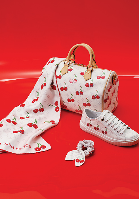 6 화이트 캔버스에 체리 패턴을 넣은 루이 비통의 LV×TM 스피디 반둘리에 30 백과 LV×TM 모노그램 세리즈 스퀘어 90 스카프, LV×TM 라군 스니커즈와 LV×TM 모노그램 세리즈 스크런치.