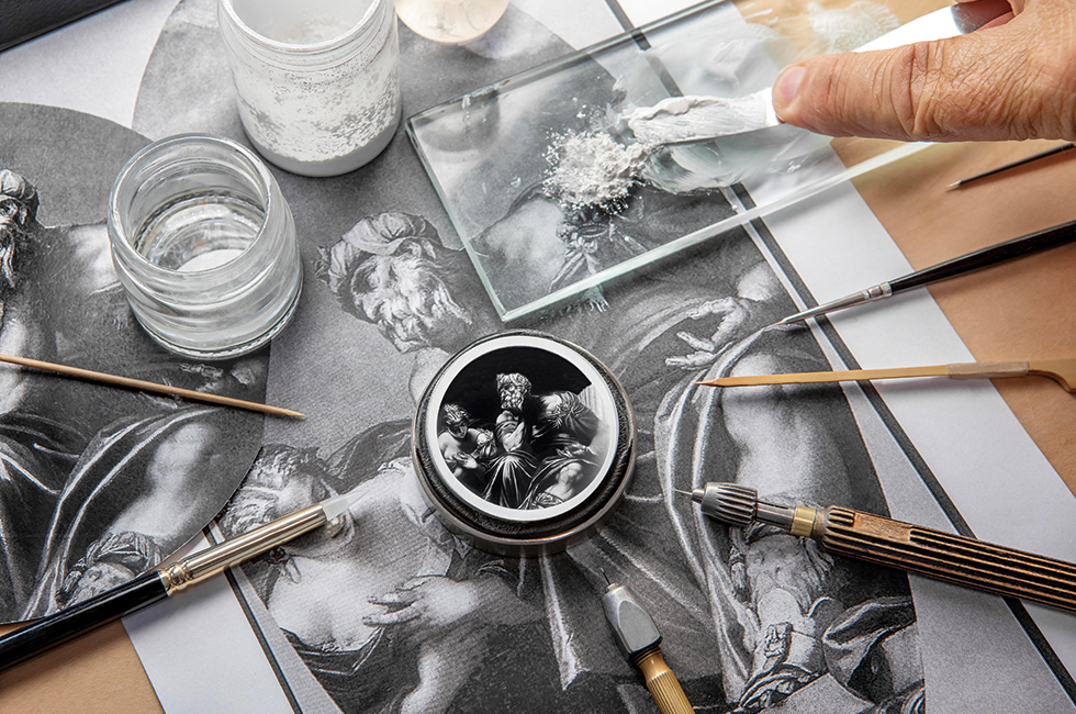 방사형 기요셰를 새긴 실버 톤 다이얼은 안개 속 풍경에서 꽃다발이 피어오르는 것 같은 인상을 준다. 회화로 치면 그리자유와 스푸마토가 어우러진 것 같은 분위기다. 페테르 파울 루벤스(Peter Paul Rubens), 안드레아 델 사르토(Andrea del Sarto), 얀 반 에이크(Jan van Eyck)의 회화는 물론 르네상스 시대의 이탈리아 궁전 장식이나 18세기 프랑스 귀족 저택의 문 장식을 떠올리게 한다. 1780년에 제작된 이 다이얼은 메종이 초창기부터 장식 예술에 깊은 관심을 가졌음을 보여준다. 단순히 시간을 알려주는 것을 넘어, 시각적 즐거움을 전하려는 의지가 깃들어 있다. 엉겅퀴나 아칸서스 잎 무늬를 넣은 샹르베 또는 클루아조네 에나멜 장식, 양식화된 꽃이나 사실적인 꽃다발, 플랭케 배경에서 돋보이는 문장이나 모노그램, 알프스 또는 토스카나의 풍경, 성모와 아기 예수, 부르주아 인테리어의 초상화, 진주, 보석, 카메오 등 바쉐론 콘스탄틴의 다이얼과 케이스는 미니어처 예술의 무대가 되어왔다. 18세기, 장-마크 바쉐론은 제네바를 중심으로 활동하던 독립 예술 장인들과 협업했다. 그들은 ‘장식 예술’이라는 명칭도 없던 당시에, 코담배 상자, 알약 상자, 오토마통 등에서 두각을 나타냈다. “이러한 장식 예술은 1960년대까지 이어졌지만, 쿼츠 시계와 스포츠 시계가 등장하면서 쇠퇴하기 시작했죠. 이후 1990년대 후반부터 바쉐론 콘스탄틴은 이 기술들을 되살리며 선구적인 역할을 하게 됩니다.” 바쉐론 콘스탄틴의 스타일 & 헤리티지 디렉터 크리스티앙 셀모니의 설명이다.