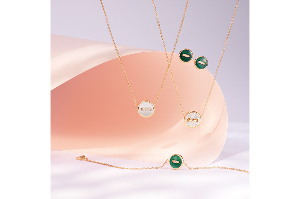 (위부터 차례대로) 단추에서 영감받아 유쾌하고 우아한 매력을 더해주는 디자인이 특징이다. 말라카이트와 다이아몬드를 세팅한 로즈 골드 소재의 폼폼닷 이어링, 한쪽 면에는 화이트 머더오브펄과 다이아몬드를, 다른 쪽 면에는 그레이 머더오브펄을 세팅한 폼폼닷 로즈 골드 소재의 펜던트, 한쪽 면에는 다이아몬드를 세팅하고 다른 쪽 면에는 머더오브펄을 세팅한 폼폼닷 펜던트, 한쪽 면에는 말라카이트와 다이아몬드를, 다른 쪽 면에는 화이트 머더오브펄을 세팅해 다채로운 스타일링이 가능한 브레이슬릿 모두 가격 미정 포멜라토. 문의 02-6905-33420