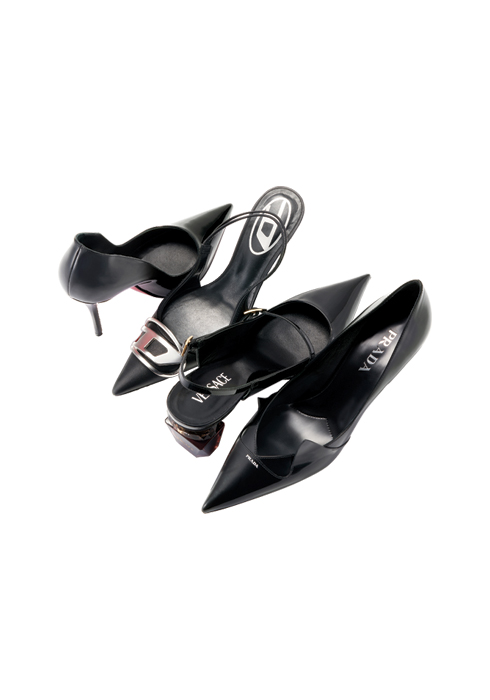 고양이 귀가 연상되는 디테일이 세련된 분위기를 연출해주는 투톤 브러시드 레더 펌프스 가격 미정 프라다. 문의 02-3442-1830.