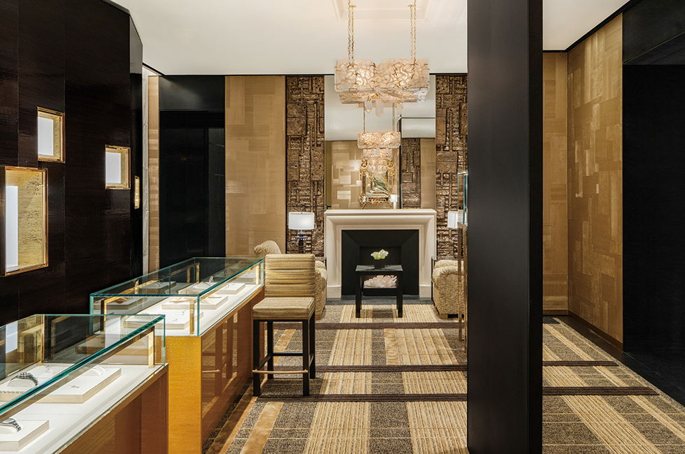 1층의 중앙 공간을 따라 이어지는 워치 & 화인 주얼리 공간은 보다 친밀한 분위기를 자아낸다. 수작업으로 금박을 입힌 천장과 섬세하게 마감한 골드 메탈 블랙 캐비닛 벽이 조화를 이룬다. 2층에도 또 하나의 워치 & 화인 주얼리 살롱이 마련되어 있으며, 아르데코에서 영감받은 카펫의 메탈릭한 디테일을 비추는 브론즈 스크린과 해머드 브론즈 메탈 캐비닛이 공간을 장식한다. 한쪽 벽난로 옆에는 피터 레인(Peter Lane)의 유약을 입힌 세라믹 벽 조각이 배치되어 있으며, 보석 세공사 로베르 구센(Robert Goossens)의 샹들리에가 화려함을 또 한번 강조하며 중심을 이룬다.