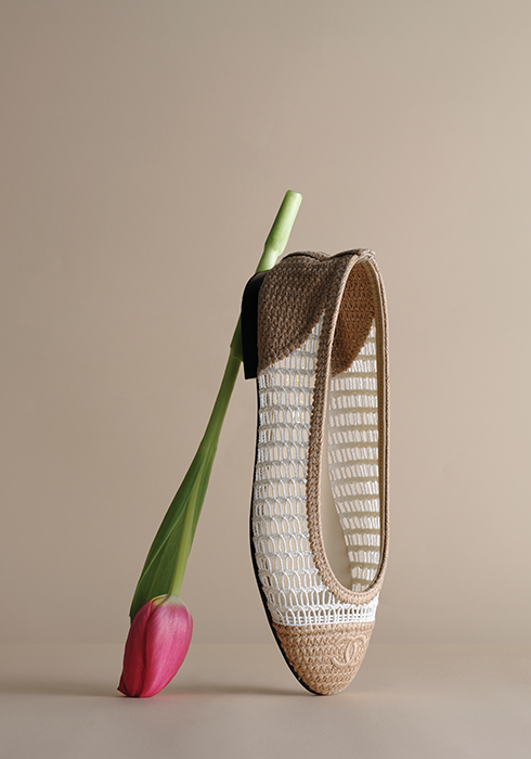 보기에도, 신기에도 시원한 느낌을 주는 화이트 라피아 소재에 베이지 컬러로 포인트를 더한 플랫 슈즈 가격 미정 샤넬. 문의 080-805-9628