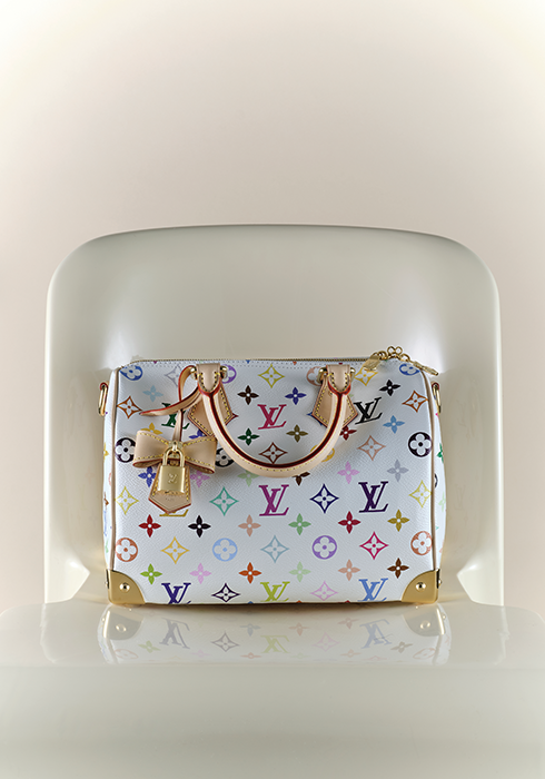 일본 예술가 무라카미 다카시를 대표하는 컬러풀한 색상으로 경쾌하게 재해석한 모노그램 모티브를 더해 생기 넘치는 버전으로 선보인 천연 카우하이드 가죽 소재의 스피디 반둘리에 25 핸드백 4백40만원대 루이 비통. 문의 02-3432-1854