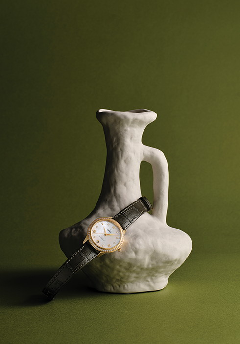 옐로 골드 케이스에 다이아몬드를 세팅한 베젤과 자개 다이얼이 여성스러움과 우아함을 부각한다. 올리브 그린 레더 스트랩의 색감이 매력적인 드 빌 프레스티지 34MM 3천1백만원대 오메가. 문의 02-6905-3301