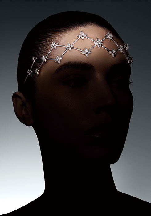 화려한 유색 보석을 세팅한 스플렌더와 달리 ‘엘레강스(Elegance)’의 헤드 밴드는 메종의 그래픽 코드를 여성스러운 디테일로 재해석했다. 이마를 가로지르고 헤어라인을 유연하게 감싸는 격자무늬 밴드는 오로지 화이트 골드와 LV 모노그램 스타 컷 다이아몬드로만 완성해 주얼리의 순수함에 매료될 수밖에 없을 것이다. 마지막으로 파리를 상징하는 에펠탑을 형상화한 ‘빅투아르(Victoire)’ 네크리스가 챕터 II의 대미를 장식한다. 제작에만 무려 3천9백23시간이 소요된 이 작품은 에펠탑의 건축적 정교함과 예술적 디테일을 하이 칼라 네크리스로 표현했다. 먼저 네크리스 중앙에 위치한 메종의 상징 V 위로 10.43캐럿과 3.08캐럿 LV 모노그램 스타 컷 다이아몬드를 수놓았다. 여기에 네크라인을 따라 일정한 간격으로 33개의 옐로 다이아몬드를 세팅했다. 보석과 주얼리, 그리고 예술의 아름다움을 넘어, 건축물에서 느껴지는 웅장함까지 감돈다. 초현실적인 미학을 암시하고 대담함과 정교함, 그리고 구조적 유연성을 넘나드는 빅투아르는 루이 비통이 19세기에 보내는 예찬 그 이상이다. 이외에 시대의 발전과 이동성에서 영감받은 ‘그라비테(Gravite)’, 구조적 링크의 강렬한 배열이 인상적인 ‘다이나미즘(Dynamisme)’, 마지막으로 산업화 시대의 활기를 담았으며, 화살 모양의 바게트 컷 다이아몬드가 포인트인 ‘비전(Vision)’ 등이 있다.