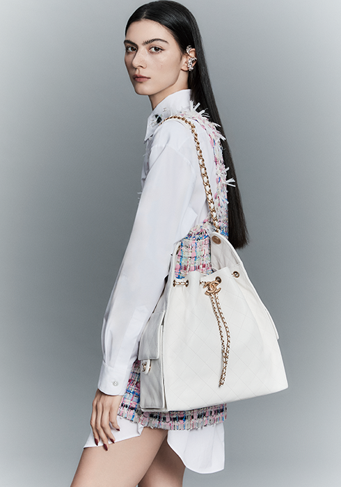 트위드 소재 드레스, 자카드 소재 셔츠, 메탈 & 스트라스 이어링, 샤넬 25 호보 백 모두 가격 미정 샤넬.
