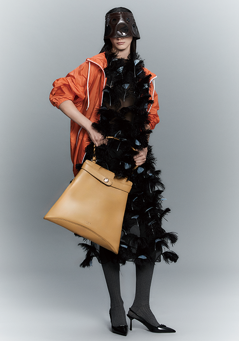 오렌지 라이트웨이트 리-나일론 레인 재킷 2백80만원, 블랙 페더 장식의 오간자 드레스 1천1백30만원, 그레이 타이츠 가격 미정, 다크 브라운 햇 가격 미정, 브러시드 레더 슬링백 펌프스 1백62만원, 라지 에뛰드 백 6백만원 모두 프라다.