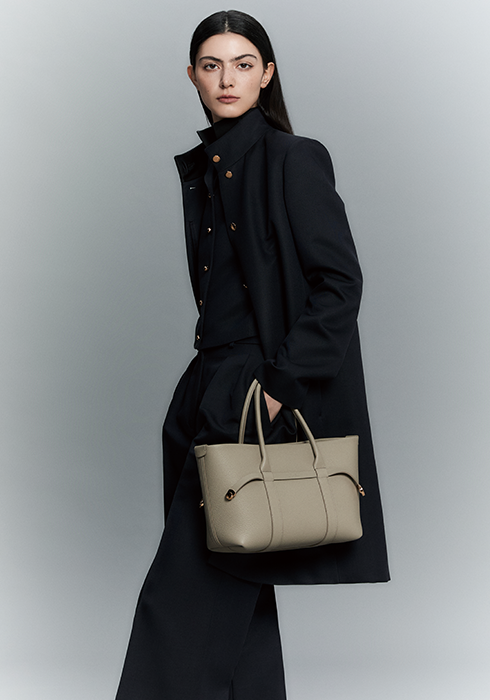 네이비 컬러 울 & 실크 소재의 카 코트, 베스트, 팬츠, 기에라 스몰 쇼퍼 백 모두 가격 미정 로로피아나.