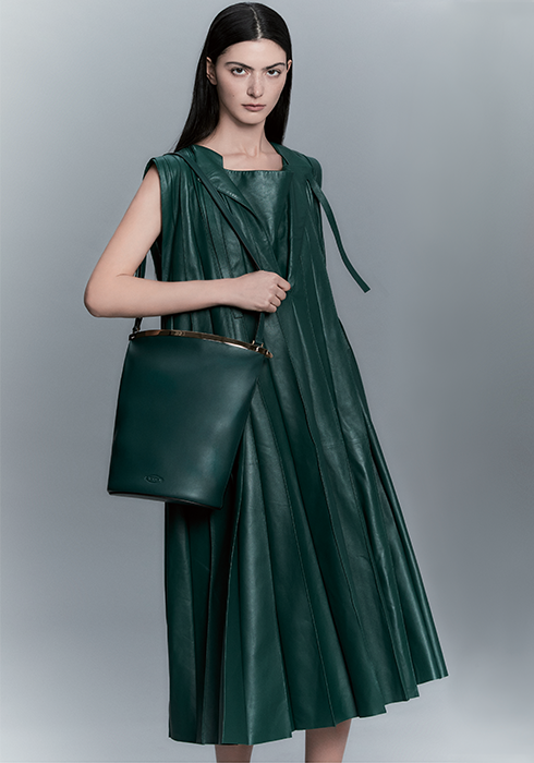 나파 레더 소재의 플리츠 드레스, 바레타 액세서리 디테일의 마젠타 버킷 백 모두 가격 미정 토즈.