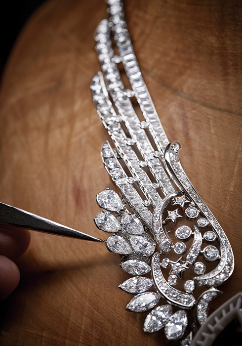 지난 6월, 샤넬의 새로운 하이 주얼리 컬렉션을 공개하는 자리가 마련되었다. 이번에 샤넬이 선택한 도시는 일본의 교토. 장인과 예술의 도시인 교토의 국립박물관에서 샤넬의 하이 주얼리 전시회가 개최된 것. 전시회 입구에는 샤넬의 진취적이고 긍정적인 라이프를 대변하는 메시지들이 마치 하늘에 떠 있는 듯 장식되어 있었다. ‘꿈은 이루어진다’, ‘당신의 심장이 시키는 대로 행동하라’, ‘사자처럼 강하게 살아남아라’. ‘리치 포 더 스타(Reach for the Stars)’라는 주제가 한눈에 느껴지는 전시장은 마치 밤하늘과 그 속에서 빛나는 별을 품은 듯 다소 어둡고, 아늑하고, 반짝임으로 가득 차 있었다. 이번 하이 주얼리 컬렉션의 모티브가 된 것은 샤넬이 사랑하던 별, 사자, 그리고 날개. 별은 가브리엘 샤넬이 그녀의 하이 주얼리 컬렉션에서 선택한 최초의 모티브이자 샤넬과 그녀의 자주적 삶을 상징하기도 한다. 사자는 샤넬의 별자리이자 진취적인 위용과 우아한 카리스마를, 새롭게 선택된 날개 모티브는 자유를 향한 갈망을 떠올리게 한다.
