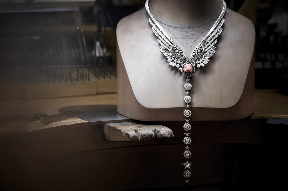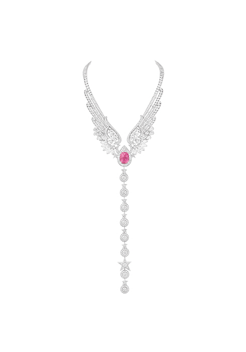 1 다이아몬드 날개가 펼쳐지면서 네크라인을 감싸는 ‘윙즈 오브 샤넬(Wings of Chanel)’. 핑크와 오렌지 컬러가 섬세하게 조화를 이루는 19.55캐럿 파파라차 사파이어가 세팅되어 있다. 브레이슬릿으로도 연출이 가능한 롱 펜던트에서도 광채를 감상할 수 있다.