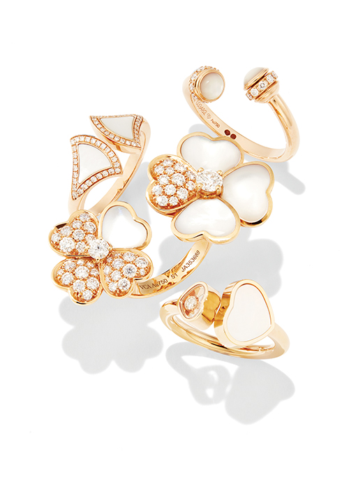 화이트 머더오브펄과 다이아몬드로 꽃을 표현한 볼륨 링 3천5백30만원대. 문의 1877-4128