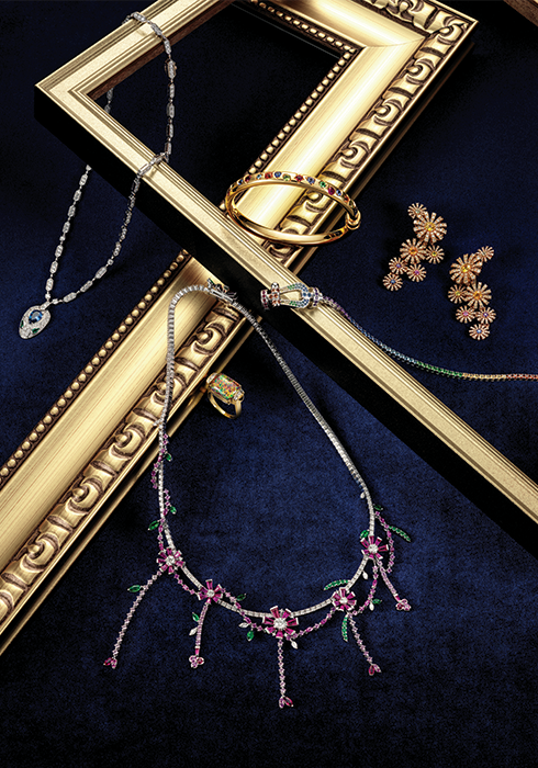 목과 쇄골 라인에 꽃들이 흩뿌려진 듯 우아한 디자인이 특징이다. 플래티넘 소재에 다이아몬드와 핑크 사파이어, 에메랄드, 그리고 루비를 이용해 꽃잎과 잎사귀를 표현했다. 가격 미정. 문의 02-3461-5558