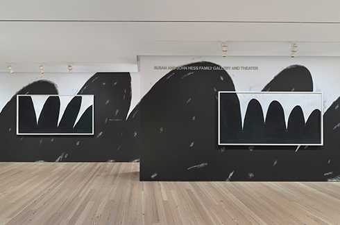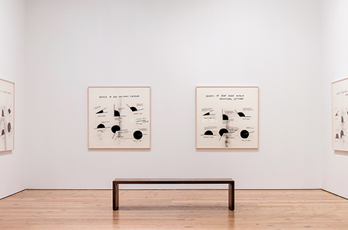 김 크리스틴 선 작가가 메시지를 전달하는 방식은 단순하고 명확하다. 음악 기보법을 차용해 소리를 그림으로 기록하거나, 미국 수어의 움직임이 만들어내는 형태를 조형화하는 식이다. 이번 뉴욕 휘트니 미술관 전시의 중심이 되는 ‘메아리(Echo)’ 연작은 후자에 해당한다. 메아리는 소리를 기반으로 하는 용어로, 반사된 소리가 다시 전달되는 현상을 의미한다. 이는 소리를 중심으로 작동하는 세상에서 경험하는 소통 방식과 밀접하게 연결되어 있는데, 수어 통역을 거치는 작가의 소통 과정에 존재하는 피할 수 없는 시간차와 반복은 의미가 반향되어 전달되는 메아리와 유사한 구조를 띤다. “지금 제 통역사 베스(Beth)도 제가 하는 말을 메아리처럼 반복해서 전달하고 있죠. 그리고 여러분이 하는 말도 수어로 메아리칠 거예요. 우리 사이의 공간에는 이런 메아리들이 존재해요.” 수어에서 메아리치는 소리의 파동은 반사면을 형성하듯 수직으로 세운 손바닥에 다른 손의 네 손가락이 닿게 한 뒤, 반대 방향으로 부드럽게 움직이며 멀어지는 동작으로 나타낸다. 작가는 이러한 손동작의 궤적이 만들어내는 형태로 전시장 하나를 가득 채웠다. 공간을 집어삼킨 듯 커다란 메아리에 작은 메아리들이 반복적으로 중첩되며 다시 하나의 거대한 메아리를 이룬다.