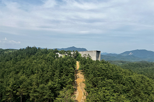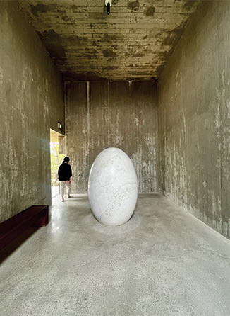 이렇듯 개인의 정원으로 조성된 사유원을 대중에게 공개되도록 물꼬를 튼 것은 ‘소요헌’이다. 건축계 최고 영예로 여겨지는 프리츠커상(1992년)을 받았을 뿐만 아니라 자연과의 조화를 추구해온 ‘건축의 시인’으로 불릴 정도로 칭송받는 알바루 시자가 설계한 소요헌에는 장자의 소요유(‘우주와 하나가 되어 편안하게 거닐다’란 의미) 사상이 반영되었다. 아마도 20세기 가장 유명한 반전(anti-war) 회화인 피카소의 ‘게르니카’의 상설 전시를 위한 작업이었던 원래의 계획대로라면 스페인 마드리드에 있어야 할 이 건축물은 프로젝트 중단으로 알바루 시자의 캐비닛에 묵혀 있었는데, 그로부터 수년 뒤 한국의 어느 지방 도시에 실현된 것이다. 알바루 시자는 전쟁과 희망을 담은, 본연의 목적이 있다며 설계도를 주기를 거절했지만, 사유원이 위치한 지역이 한국전쟁 격전지였다는 스토리텔링의 진정성으로 결국에는 그를 설득했다는 후문이다. 소요헌은 소문자 y 형태 구조로, 기존 설계안에 계획된 피카소의 ‘게르니카’와 ‘임신한 여인’ 대신 시자의 조각들이 설치되었다. 좀처럼 발걸음을 떼기 어려울 만큼 예술적 오라가 진하게 흐르는 소요헌에서 피카소의 ‘임신한 여인’ 자리에 위치한 하얀 ‘생명의 알’ 조각을 보고 뒷문으로 나오면, 사유원에서 가장 높은 건축물을 마주한다. 시자의 또 다른 작품인 ‘소대’다.