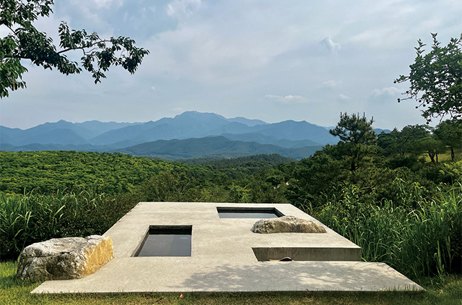 대구에서 차로 40분가량 달렸을까. 날이 좋아서인지 더욱 맑게 흐르는 듯 보이는 창평저수지를 아래 두고 팔공산을 바라보는 전망 좋은 산 자락에 자리한 사유원에 도착했다. 몇 년 전 경북 어딘가에 포르투갈이 낳은 건축 거장 알바루 시자(A´lvaro Siza)의 ‘작품’이 놓인 거대한 산지 정원이자 수목원이 문을 연다는 소식을 듣고 방문 일정을 고심만 했다가, 이번 국립현대미술관 서울에서 열리는 조경가 정영선 전시에서 다시 접하고는 드디어 실행에 옮겼다. ‘정원’이라지만 그래도 산에 올라야 하니 너무 춥지도 덥지도 않은 6월 초는 나름 이곳을 찾기에 적기가 아닐까 싶다. 사유원에 도착하자마자 첫눈에 들어온 것은 입구에 세워진 치허문이다. ‘극도의 비움에 이르러 지극한 평온을 지키다’라는 노자의 도덕경 16장 치허극 수정독(致虛極 守靜篤)에서 따온 이 이름은 이곳이 단순한 휴식 공간이 아님을 알려준다. 자연을 오롯이 느끼고 거닐면서 자신의 내면을 바라보고 치유할 수 있는 장소로 세심히 설계된 덕인지, 마음속 깊은 곳에서부터 평온함이 느껴져온다.
