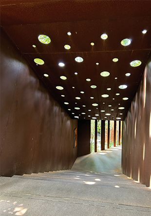 사유원 곳곳에서 볼 수 있는 기발한 명칭이나 아이디어에도 영감을 준 것으로 알려진 승효상 건축가가 설계한 건축물도 여럿 있다. 다소 외진 곳에 있어 사람들의 발걸음이 비교적 드문 ‘와사(명상의 수도원이 물길 따라 누웠다는 의미)’는 잔잔하지만 오랜 여운을 남긴다. 와사는 붉은 코르텐강을 접어 만든 구조물로, 생태 연못을 바라보며 물소리, 새소리를 들을 수 있는 곳이다. 기도소, 식당, 도서관, 침실 등 수도원 공간을 은유적으로 표현해 네 곳으로 구획되어 있고, 건축 터에 자리 잡은 나무들을 자르거나 해치지 않으며 조화를 이룬다.