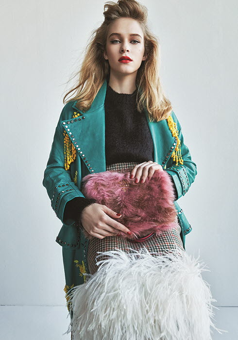 스터드 주얼 디테일의 코트 가격 미정, 블랙 니트 톱 1백30만원대, 페더 디테일의 체크 스커트 가격 미정, 핑크 퍼 숄더백 2백90만원대 모두 프라다.