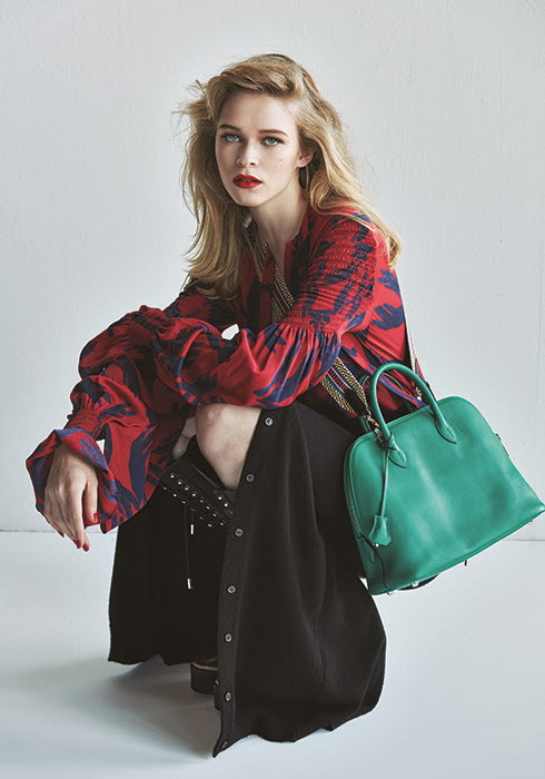 패턴 롱 드레스, 그린 토트 숄더백, 레이스업 부츠 모두 가격 미정 에르메스. |