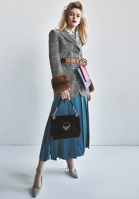플라워 패턴 셔츠 2백27만원, 플리츠스커트 가격 미정, 체크 패턴 재킷 가격 미정, 레더 벨트 가격 미정, 벨트에 레이어드한 파우치 백 가격 미정, 블랙 토트백 가격 미정 모두 펜디. 그레이 스틸레토 힐 가격 미정 막스마라.