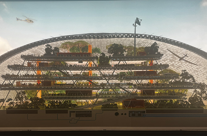 NF 1970년대 초반에 미래의 작업 공간인 기후사무소를 설계했습니다. 나무와 식물이 섞인 층계형 바닥으로 넓게 유리로 둘러싸여 자급자족하는 내부 미기후를 만들어냈습니다. 이는 미국 생물학자이자 자연주의자인 에드워드 O. 윌슨이 ‘바이오필리아’(1984)에서 인간이 자연 세계와의 연결을 본능적으로 추구하는 경향이 있다는 이론을 밝히기 10년 전의 일입니다. 저는 1960년대부터 건축에서 자연의 중요성을 주장해왔습니다. 기후사무소는 미래에 실현될 수 있기를 희망하는 프로젝트죠. 이 프로젝트의 아이디어는 현대 건축에서 바이오필릭 디자인을 통합하는 데 중요한 역할을 할 수 있으며, 우리가 멕시코시티 공항 터미널 설계에서 시도했던 요소들을 반영해 더욱 발전시킬 수 있습니다. 안타깝게도, 2018년에 새로 당선된 대통령의 정치적 제스처로 프로젝트가 취소됐습니다. 건설이 상당히 진행된 상황이라 취소 비용이 완성하는 데 드는 비용보다 더 많았을 것입니다.