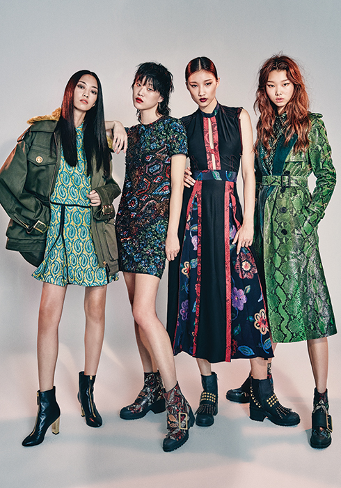 (두 번째) 시퀸 장식이 화려한 멀티컬러 미니드레스 8백50만원, 파이톤 소재의 앵클부츠 3백60만원 모두 버버리. (세 번째) 파이톤 패턴 라인과 플로럴 패턴이 멋스러운 실크 크레이프 드레스 4백20만원, 골드 스터드 장식의 투박한 슈즈 1백70만원 모두 버버리. (네 번째) 강렬한 느낌을 주는 파이톤 소재 트렌치코트 8백만원, 메탈릭한 자카드 스커트 드레스 가격 미정, 멀티컬러 앵클 슈즈 3백60만원 모두 버버리. |