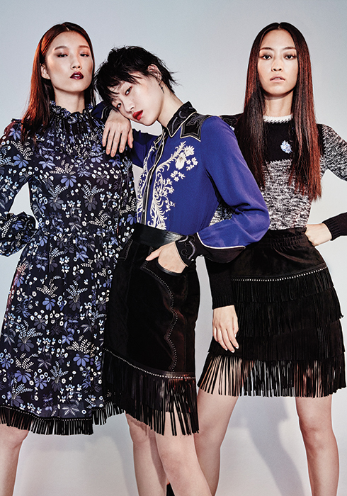 (가운데) 오리엔탈 무드를 자아내는 패턴이 멋스러운 셔츠, 프린지 디테일 스웨이드 스커트 모두 가격 미정 페이.