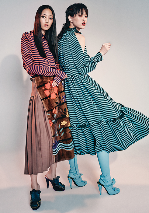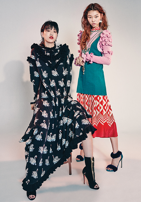 (오른쪽) 진주 장식과 러플 디테일이 사랑스러움을 자아내는 니트 미니드레스 4백78만원, 그래픽적인 패턴이 돋보이는 롱 드레스 3백98만원 모두 구찌. 실버 미러 이어링 14만원 넘버링. 퍼를 트리밍한 스트랩 힐 가격 미정 스튜어트 와이츠먼. |