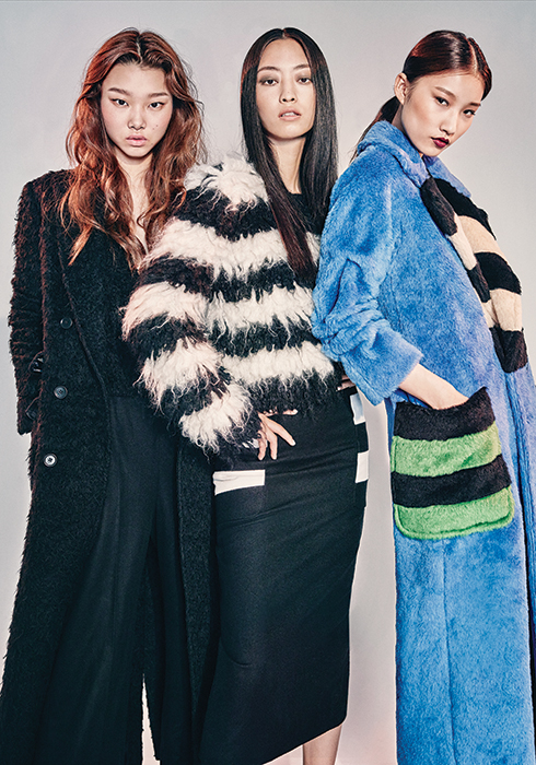 (가운데) 블랙 & 화이트 퍼 톱, 블랙 컬러 미디스커트 모두 가격 미정 막스마라. (오른쪽) 스트라이프 패턴을 더한 블루 컬러 롱 코트 가격 미정 막스마라. |