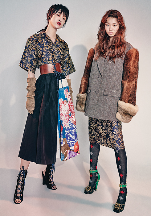 (왼쪽) 큼직한 플라워 패턴의 클로켓 셔츠 1백만원대, 브라운 컬러 레더 뷔스티에 60만원대, 다양한 소재와 패턴을 패치워크한 롱스커트 2백90만원대, 벨벳 소재의 앵클부츠 가격 미정, 브라운 니트 글러브 가격 미정 모두 프라다. |