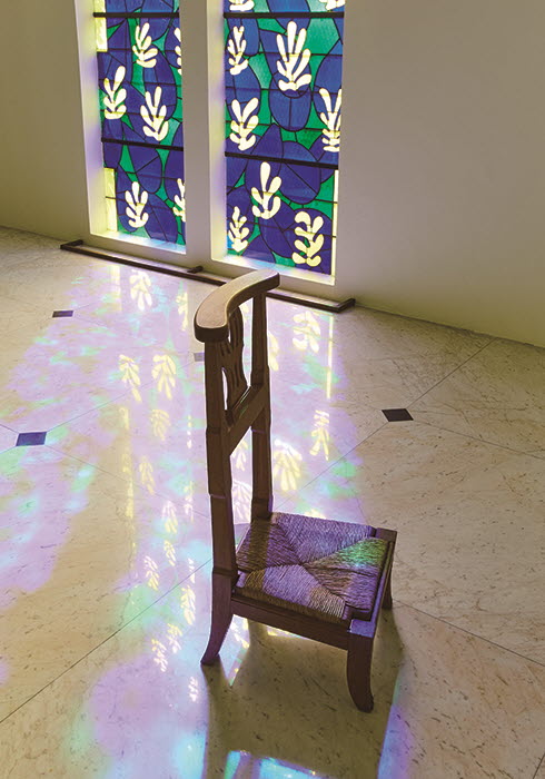 3 예배당 창문을 장식한 마티스의 스테인드글라스 디자인과 역시 작가가 디자인한 의자. 유리를 통해 예배당 내부로 떨어지는 빛의 물결이 아름답다. 색채의 표현력을 평생 탐구해온 마티스는 예배당 자체를 작품 세계의 정점으로 여겼다.