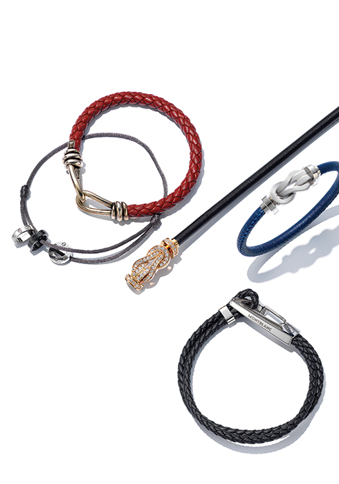 화이트 다이아몬드를 화려하게 세팅한, 나비 매듭을 닮은 매력적인 핑크 골드 버클에 블랙 레더 케이블을 매치한 8°0 브레이슬릿 1천1백만원대, 화이트 골드 버클에 블루 레더 케이블을 연결한 8°0 브레이슬릿 3백만원대 모두 프레드.
